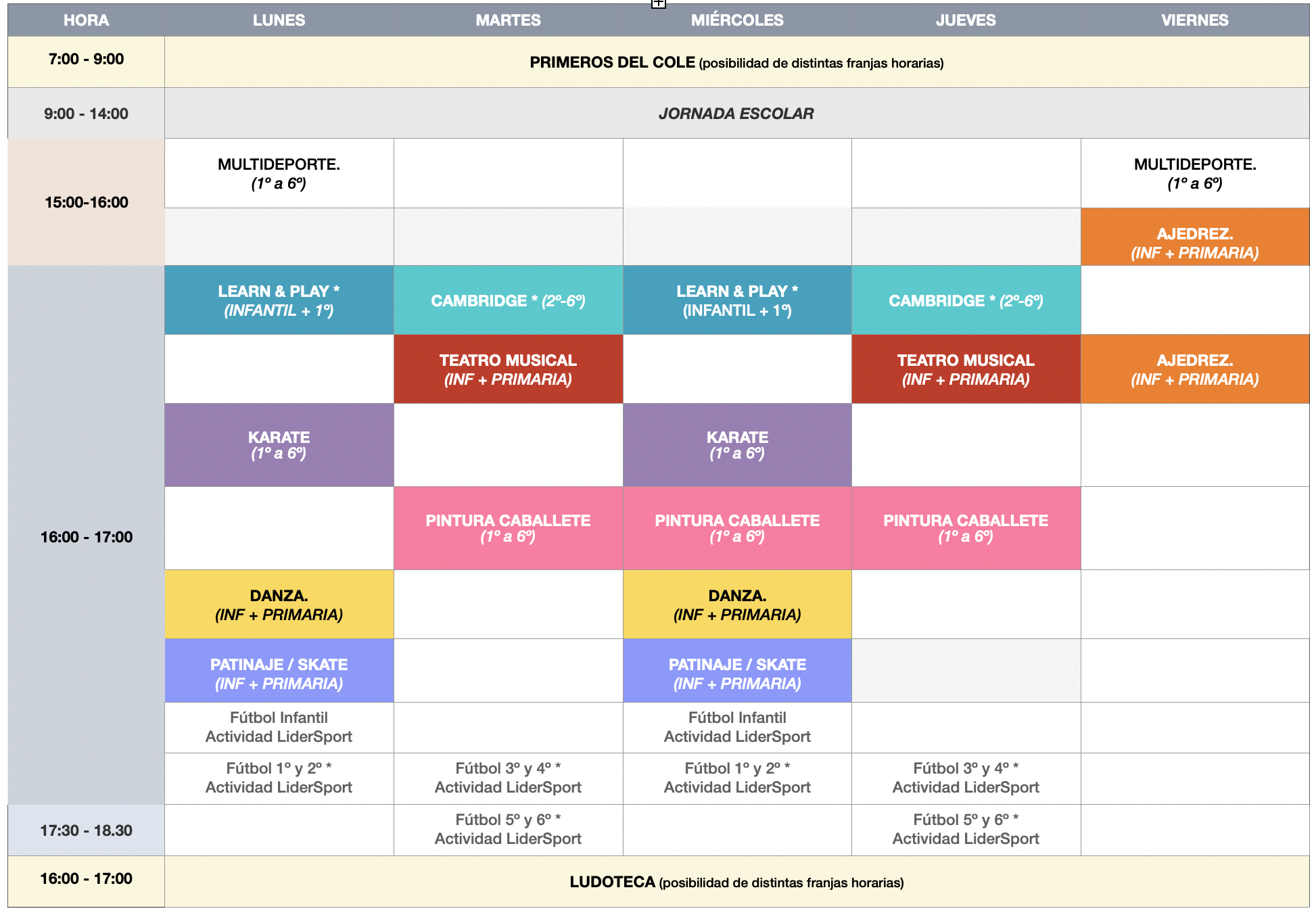 Por fin podemos presentaros nuestra oferta de extraescolares para este año. Los cambios que podáis observar respecto al curso 2025/26 han sido motivados única y exclusivamente por la mejora en la organización y gestión de las mismas, siempre pensando en el beneficio global y no individual.